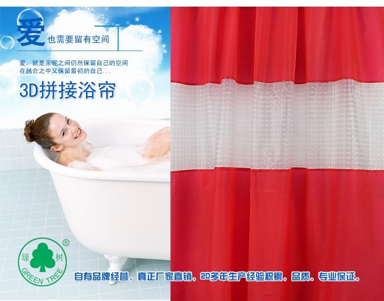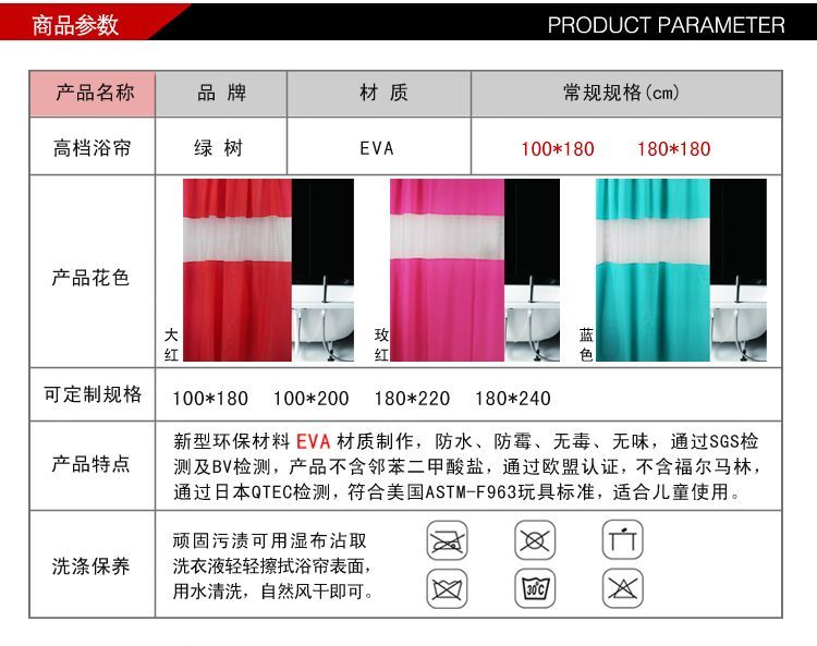 【材質(zhì)】: EVA,環(huán)保,不含鄰苯二甲酸鹽,對人體沒有危害 【規(guī)格】:140*200cm, 170*200cm, 【特點(diǎn)】:浴簾美觀高雅,時尚個性,防水,帶給您非凡的品味生活